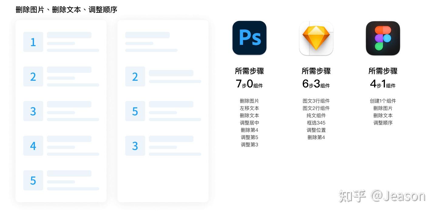 - Photoshop: 没有组件的概念,所以只能傻傻的干了。首先删除图片,左移文本,删除2的文本,调整居中,删除第4,调整第5到第3,调整第3到下面。主体操作就有7步之多。