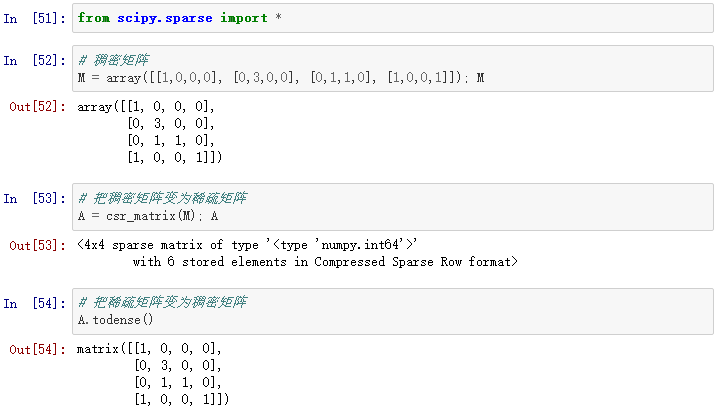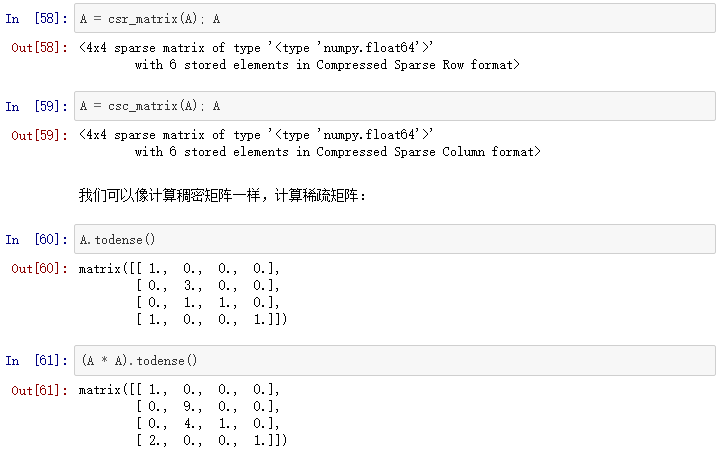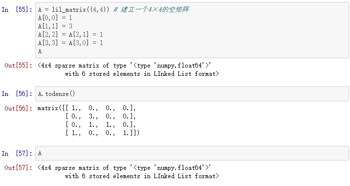 许多方法都能有效存储稀疏矩阵,一些常用的方法包括坐标形式(COO),列表的列表形式(LIL),压缩稀疏列(CSC)和压缩稀疏行(CSR)。每种方法都有优势和不足。大多数的计算算法(解方程,矩阵和矩阵相乘等等)都能用CSR或者CSC形式处理,但是它们并不直观,也不太容易进行初始化。所以通常来说,稀疏矩阵采用COO或者LIL进行初始化(我们可以在稀疏矩阵中有效添加元素),然后再转换为CSC或者CSR并进行计算。