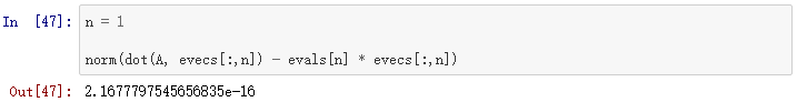 第n个特征值(储存在evals[n]中)对应的特征向量是evecs的第n列,也就是evecs[:,n]. 为了验证它,我们尝试把矩阵和特征向量相乘,并与特征向量和特征值的乘积做比较: