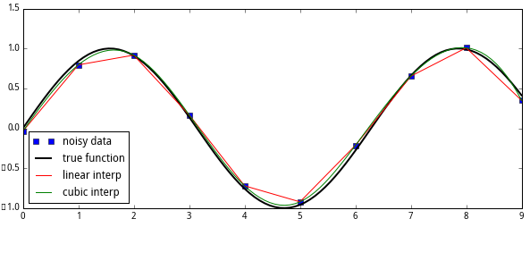 插值在SciPy中能够很容易和方便的实现:interpid函数,当描述X和Y的数据时,返回值是被称之为x的任意值(X的范围)的函数,同时返回相应的插值y:
