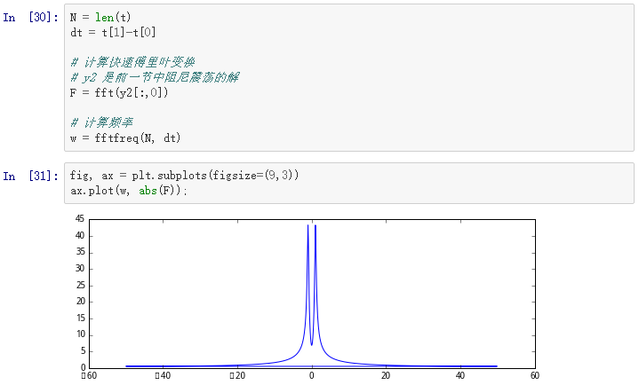 和预期一样,我们看到谱线图在1处达到最高点,这正是在阻尼震荡这个例子中所采用的频率。