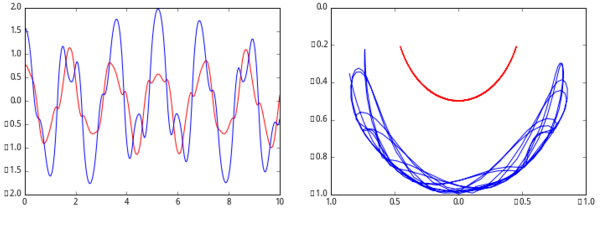 x是振荡器的位置, \omega_{0} 是频率, \zeta 是阻尼比。为了写出标准形式的二阶常微分方程,我们引入 p=\frac{dx}{dt} :
