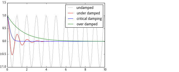 常微分方程问题对计算物理非常重要,下面我们来看另一个例子:阻尼谐波振荡器。关于概念的解释详见 http://en.wikipedia.org/wiki/Damping.