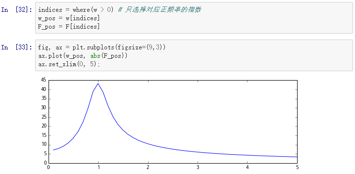 由于信号是实数,所以谱线图是对称的。我们因此只需要画出对应正频率的部分。为了提取w和F的部分,我们可以运用NumPy库:
