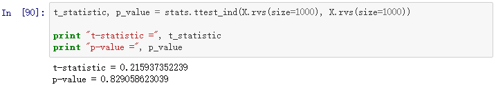 因为p值很大,我们不能拒绝原假设(两组随机数据有相同的均值)。