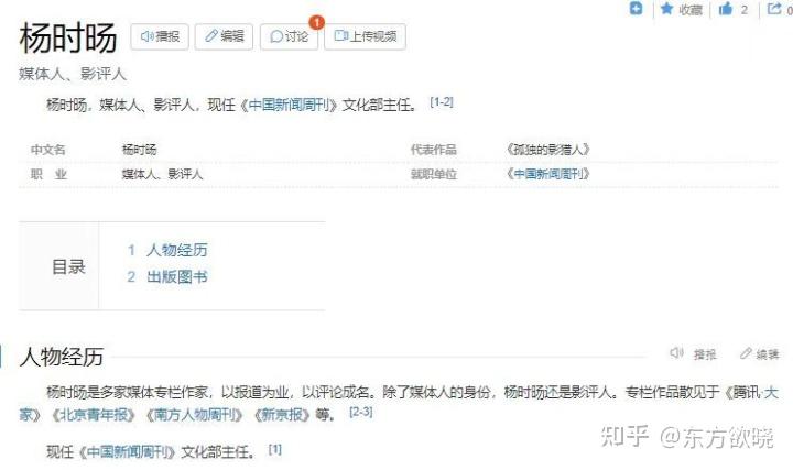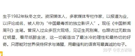 在百度百科等平台上,其个人简介,明显具有个人撰写色彩,简介中的标签词,料想是其憧憬的社会人社——“以报道为业,以评论成名”“跟访过无数当红明星”“中国最毒舌的独立影评人”“除了媒体人的身份,杨时旸还是影评人”。