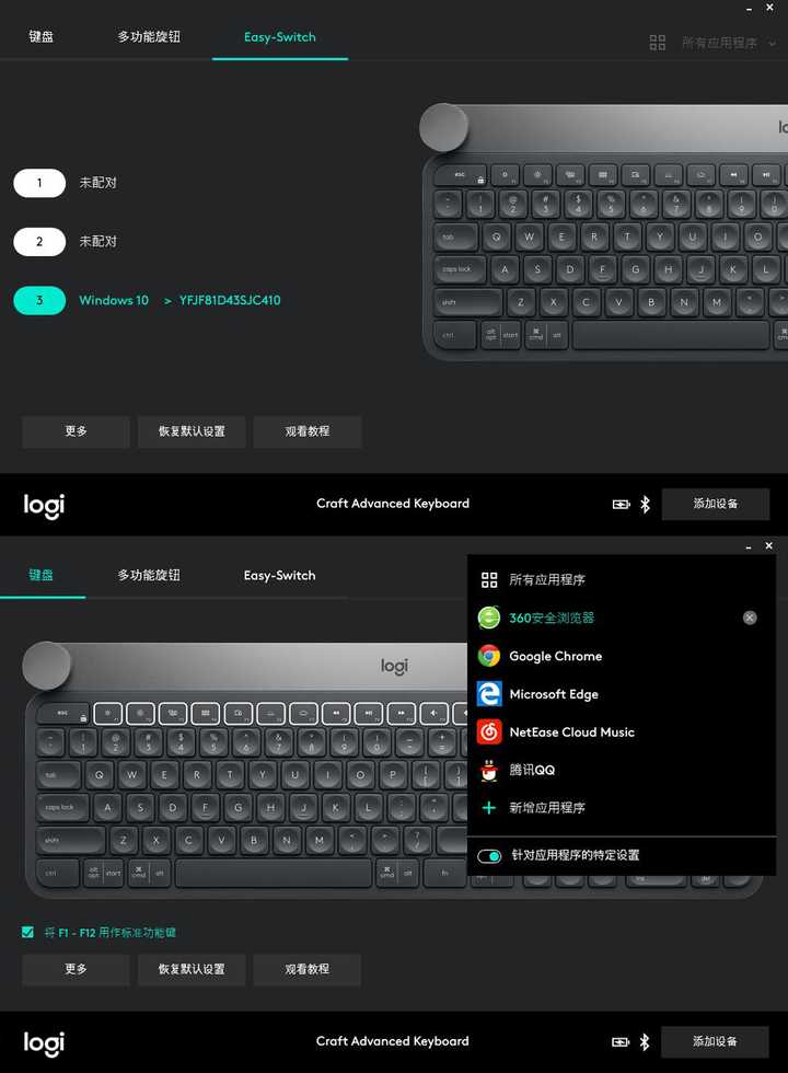 键盘的配对情况,支持最多三个设备的配对,可以自己添加,而且在键盘上可以快速便捷的去切换在各个设备之间的输入,多个设备同时操作也能快速搞定。然后软件的右上角就是添加程序的地方,只有把程序添加进去后才能使用键盘上的多媒体功能,软件会自动读取电脑中可以和键盘匹配的软件,没有的话就不能用快捷功能了,但是不知道为什么,我的网易云音乐好像是用不了。