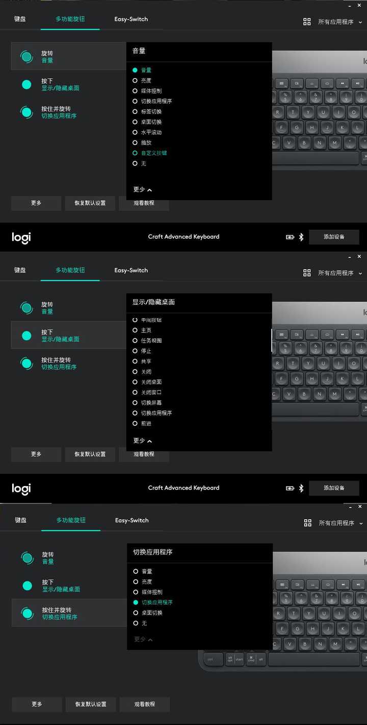 先介绍下旋钮功能的冰山一角,图片上的仅仅是软件上可以设置的,都比较简单,每个手势都对应着很多不同的功能,可以根据自己平时使用的习惯来调整。