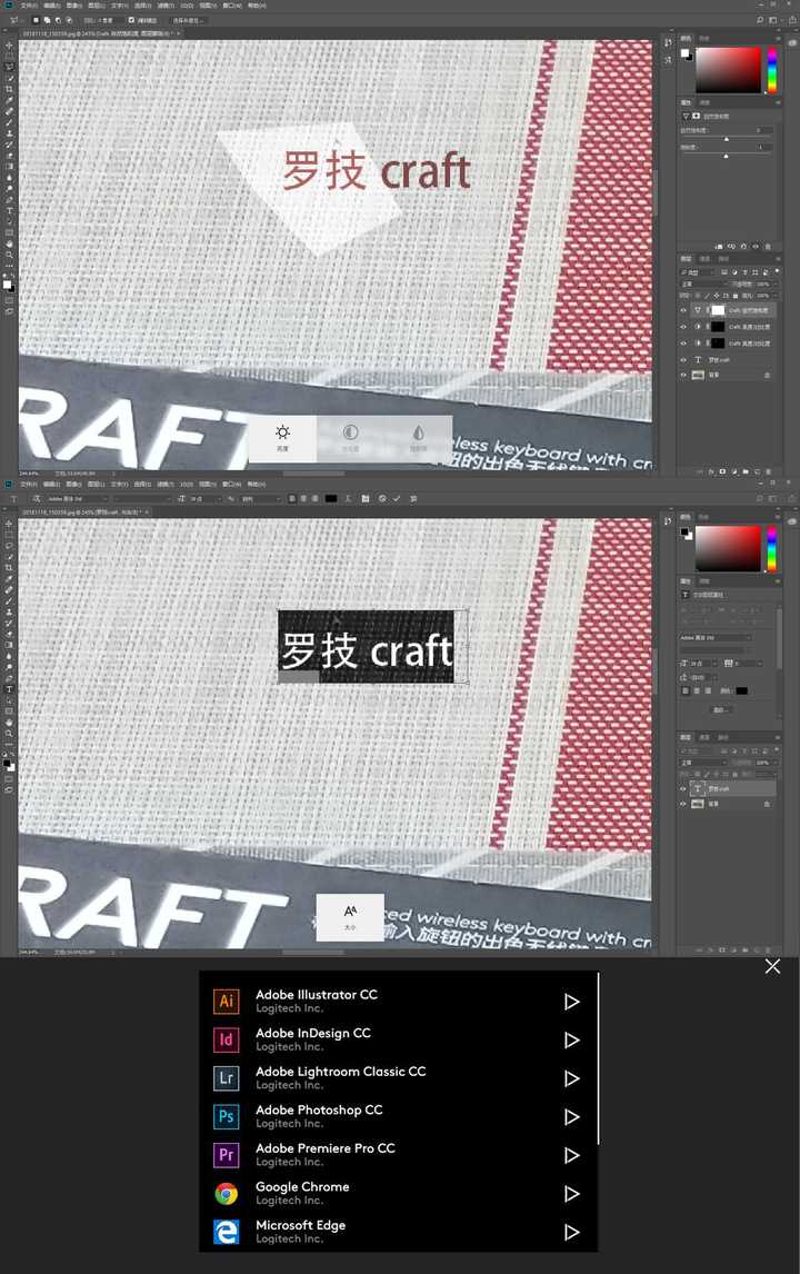 然后下面就是旋钮按键的是一些实际操作,关于一些办公的软件,不过可惜的是,我电脑上唯一能用的软件就是PS CC了。比较尴尬的是这个旋钮按键好像只针对这些软件的最新版本,如图中所展示的,之前下载的一些老版本的都用不了,Excel和Word我用的是WPS的,所以很遗憾,也是用不了的。但是仅从PS CC上就可以体现它能带给我们的便捷了,图片的缩放、字体的大小、颜色的调整、亮度的调整,还有诸如此类的很多微调的功能,你都可以通过这个旋钮完成,让你的作品能够更加细致入微,更好掌握。