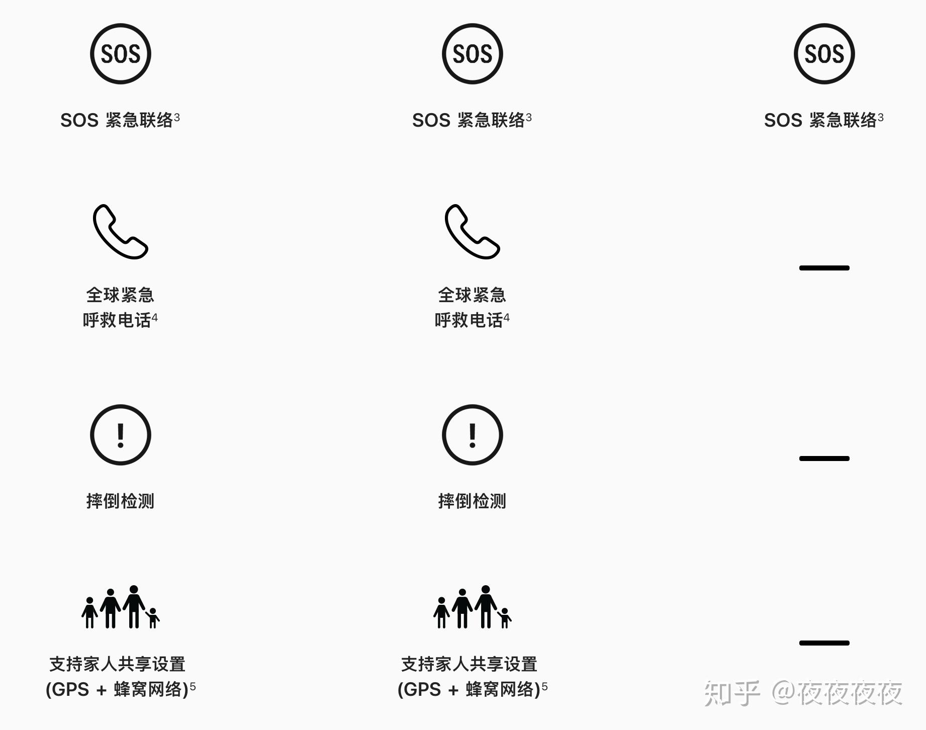 SOS 紧急联络这个功能,需要通过蜂窝功能来实现,没有蜂窝功能的Watch可以通过手机来实现,所以这3款表都有这个功能。