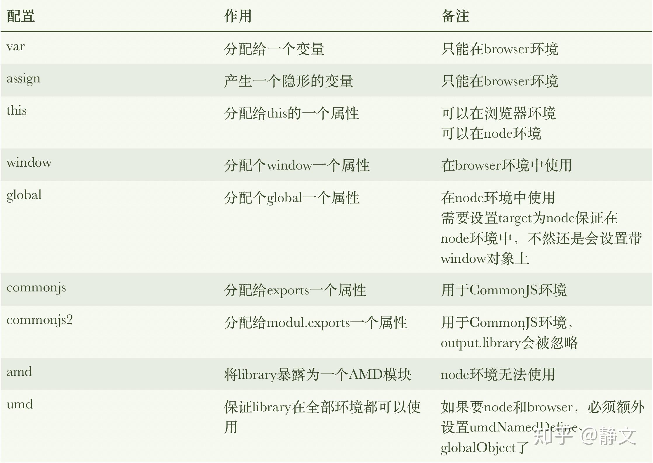 - libraryTarget:“assign”,暴露一个未定义的library设置的变量。在node环境不支持。