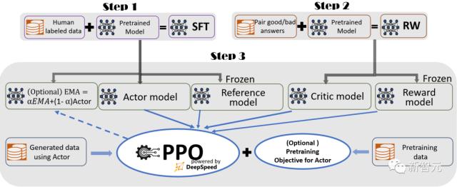 DeepSpeed-Chat的RLHF训练流程图示,包含了一些可选择的功能