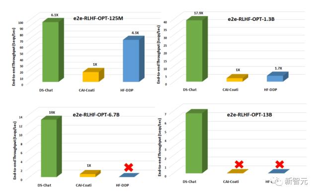在单个节点的多个GPU上,DeepSpeed-Chat在系统吞吐量方面比CAI-Coati提速6-19倍,HF-DDP提速1.4-10.5倍。