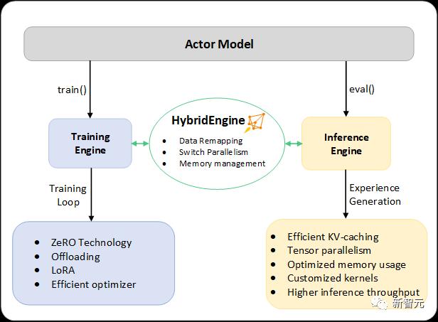 混合引擎可以在训练和推理中无缝地改变模型分区,以支持基于张量并行的推理,和基于ZeRO的训练分片机制。