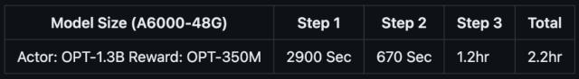 如果你只有半天的时间,以及一台服务器节点,则可以通过预训练的OPT-13B作为actor模型,OPT-350M作为reward模型,来生成一个130亿参数的类ChatGPT模型:
