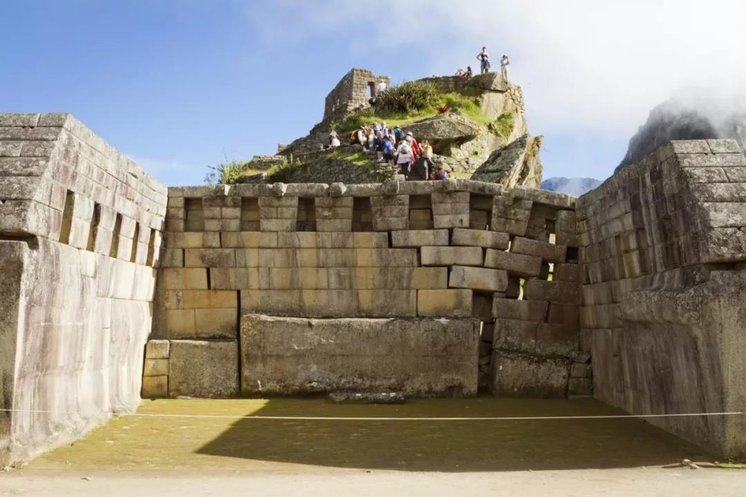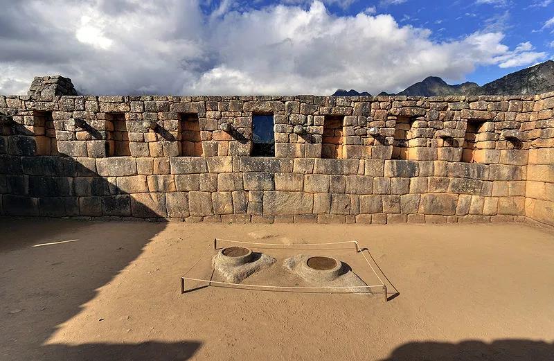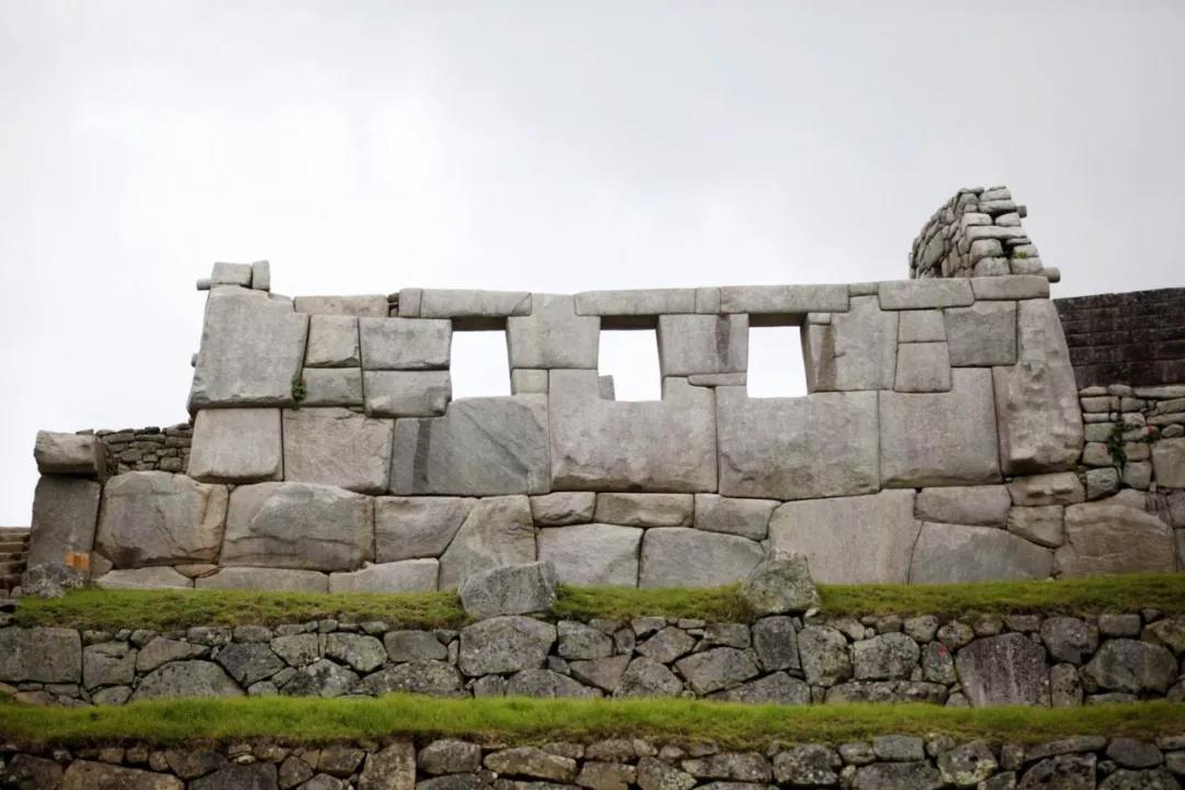 紧挨着主神庙的 三窗庙 是马丘比丘最重要的神庙之一,巨大石墙上三个梯形窗口 正对着安第斯山脉的层峦迭嶂 ,工整的窗口是石雕功力的彰显。据推测三窗庙可能没有屋顶,以便祭司随时可以 观测星象 ,窗子外不远处有一块矩形石条,推测曾用作观察太阳,或举行宗教仪式时使用。