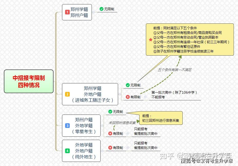 这种情况下,父母需要同时满足:在郑州市注册学籍学校连续就读三年、购房合同、父母任意一人拥有一年以上的社保、劳动合同或营业执照、父母任意一人有暂住证、学生初中综合素质C级以上,这样孩子可以填报郑州市所有高中,也可享受分配生资格。