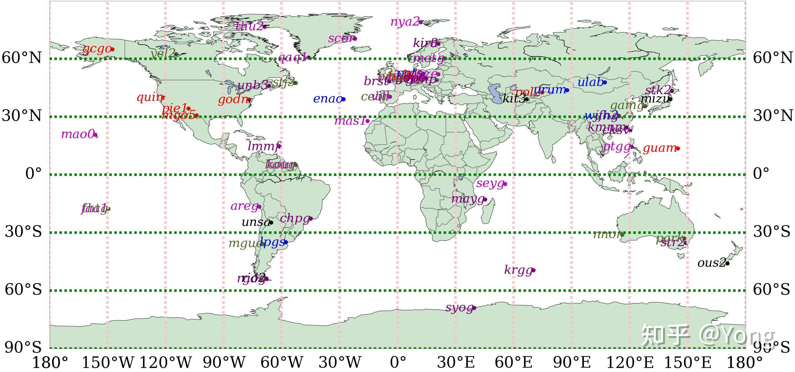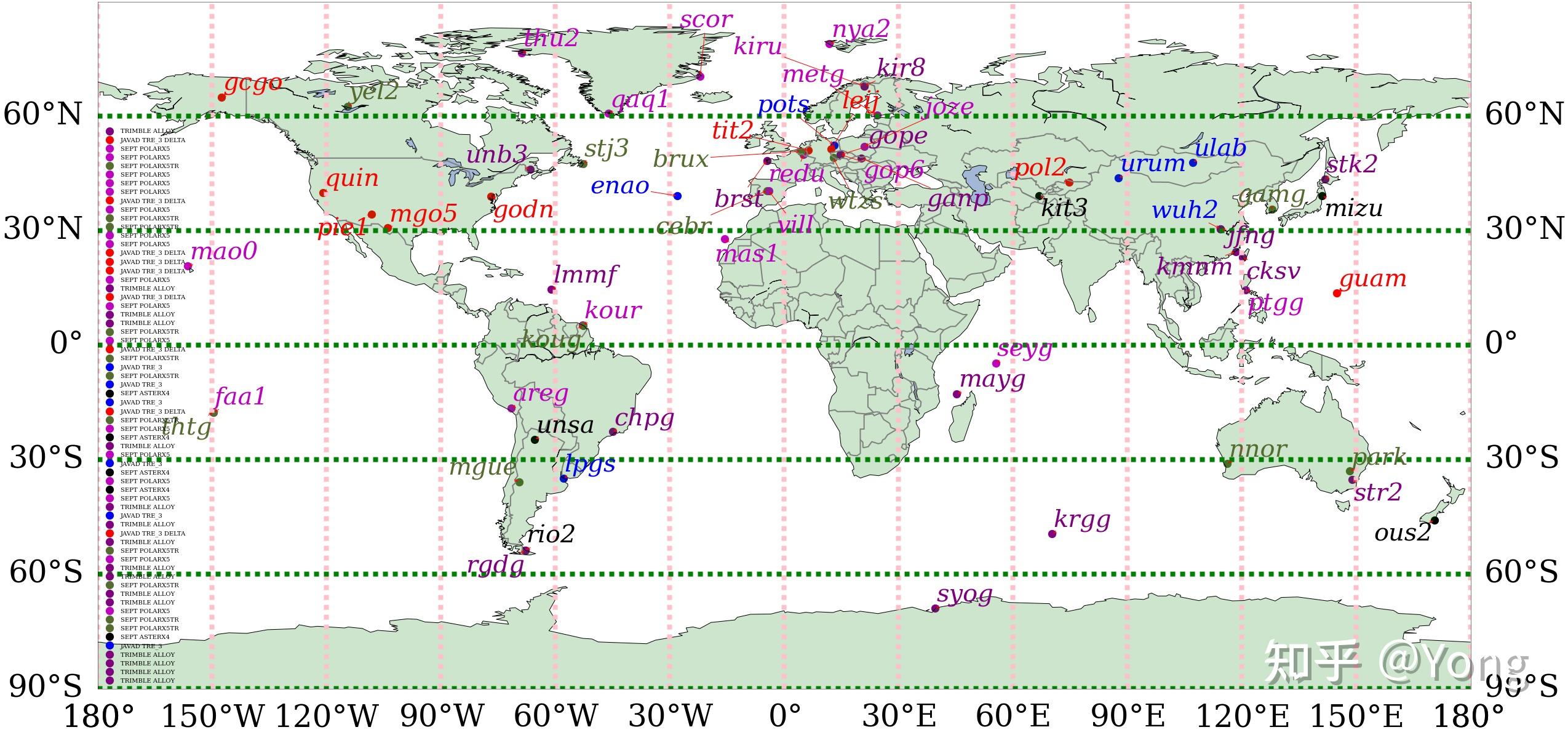 ,本文就从挑选其中一方面详细介绍一下,并对其中未提到的一些细节补充一下。 本文将详细介绍如何使用Python (Basemap库函数)绘制一张美观的测站分布图(解决了plt.text()文字重叠的问题,以及标签的设置),先上最终结果图,分布图包含了测站的名称和接收机类型。首先上最终效果图: