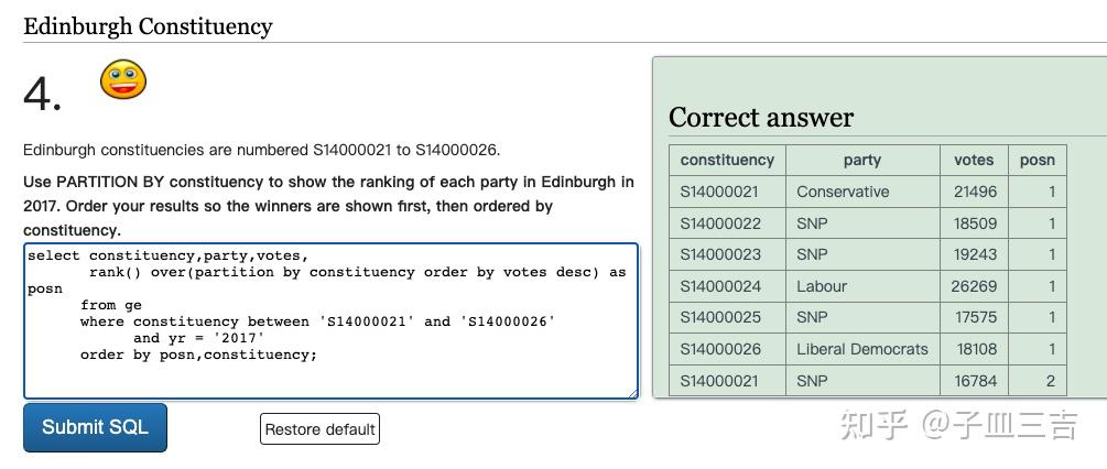 ❤️ 练习题四:选区 Edinburgh 为 S14000021 到 S14000026。使用 partition by,显示该选区 2017 年选举时各政党的排名。对结果进行排序,首先显示获胜者,然后按选区排序。
