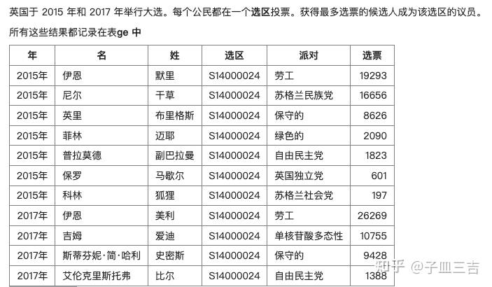 ❤️ 练习题六:使用 count 和 group by 查看每个政党在苏格兰的表现。苏格兰选区以 “S” 开头。查询 2017 年苏格兰每个政党的当选人数。