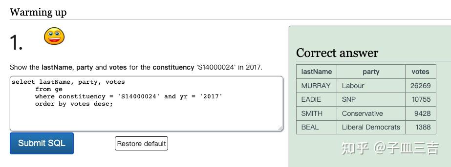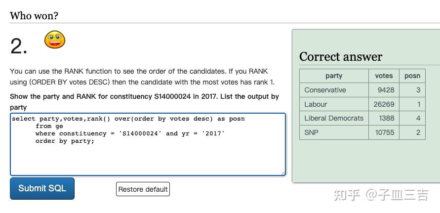 ❤️ 练习题二:使用 RANK 函数可以查看候选人的排名。如果使用 (ORDER BY votes DESC) 进行排名,则得票最多的候选人将获得排名 1。查询 2017 年选区 S14000024 的政党及其排名,结果按政党列出。