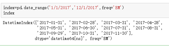 BM是指的每个月的最后一个工作日,则2017.01.01-2017.12.01就按照每个月的最后一个工作日隔开。“BM”代表business end of month。例如H是hour,M是month,D是day,A是year,也可以使用其他的值。