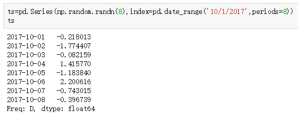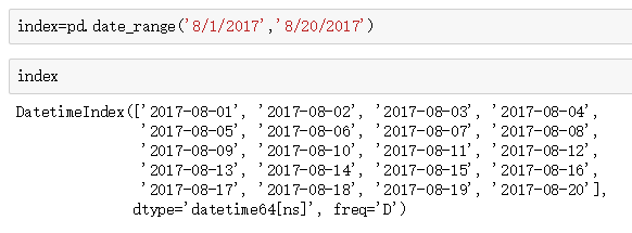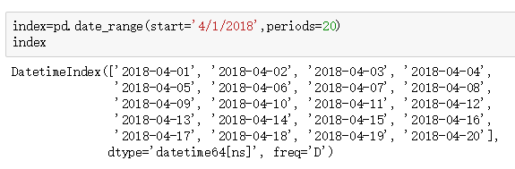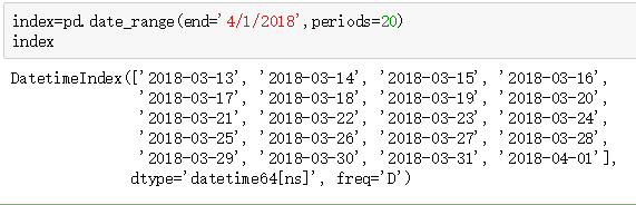 我们也可以只输入起始时间或者结束时间,然后使用periods确定时间的时长。起始时间使用start表明。freq='D'就是指,间隔为天。