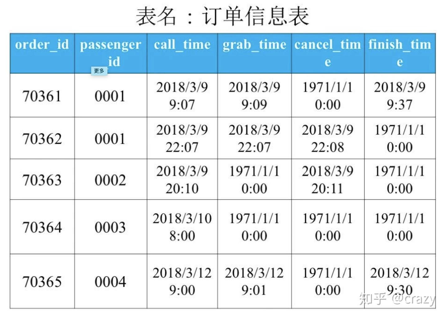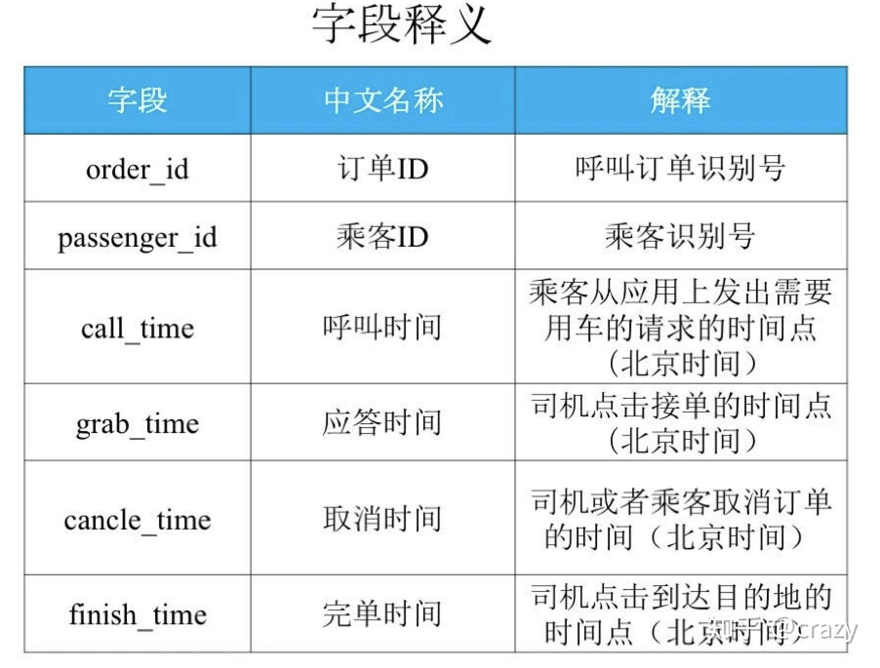 注意:表中的时间是北京时间,巴西比中国慢11小时;应答时间列的数据值如果是1970年,表示该订单没有司机应答,属于无效订单。