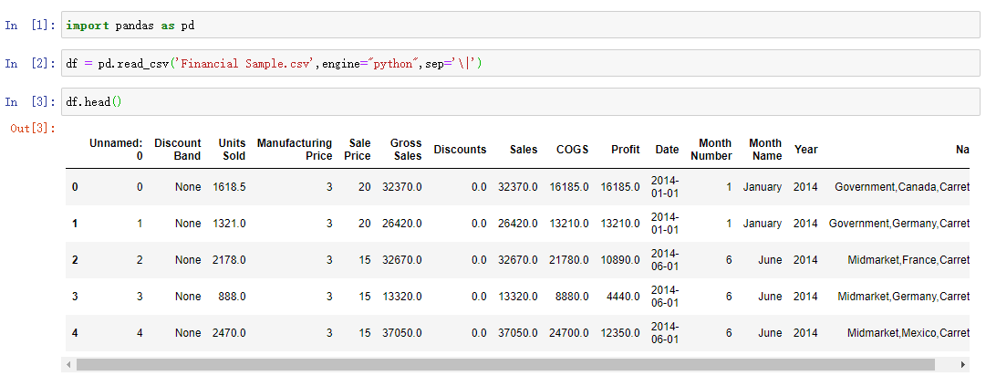 |Discount Band|Units Sold|Manufacturing Price|Sale Price|Gross Sales|Discounts| Sales|COGS|Profit|Date|Month Number|Month Name|Year|Name