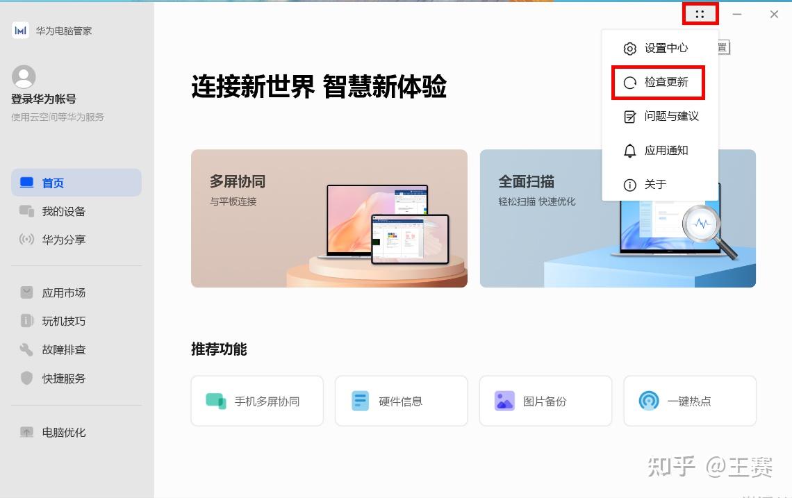 1.打开华为电脑管家,点击右上角四个点图标,选择检查更新。