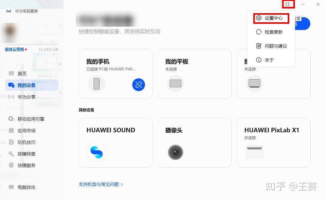 - 打开华为电脑管家,点击右上角四个点图标,选择设置中心。