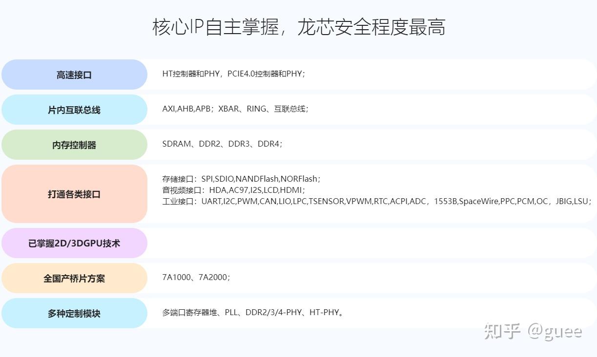 这几家公司在信息公开方面,龙芯做得最好,从龙芯的官网上能下载它各种芯片产品的详细资料。其中一张列举了龙芯各种自研IP的表格挺有意思,在其它几家的网站上完全没有类似的内容。从CPU到GPU(集成在7A2000桥片中),再到桥片和各种接口控制器,主板上重要的部分几乎包圆了。