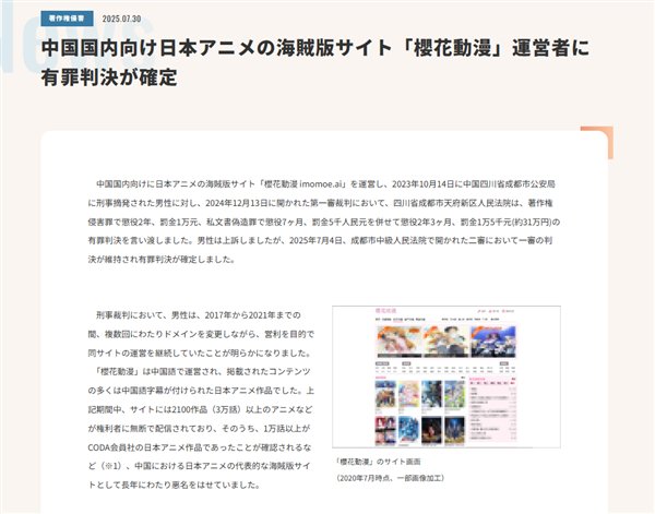 中国两大视频平台运营公司,针对其从日本权利人处获得正规授权许可的约180部日本动画(约2000集)被“樱花动漫”擅自传播一事,于2021年8月向公安局提起了刑事控告。