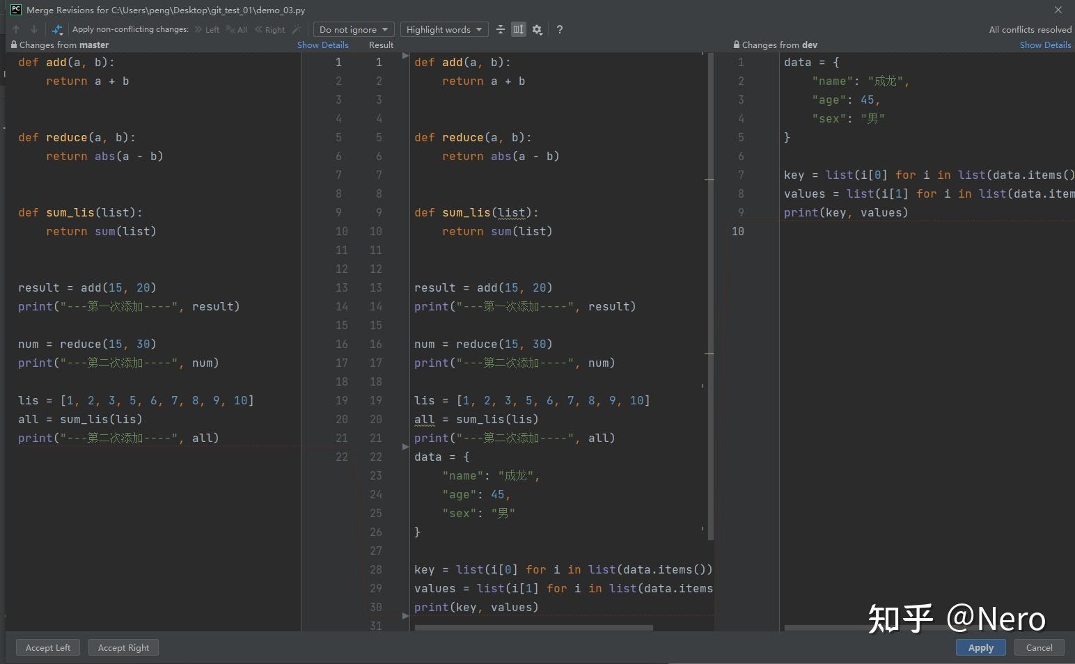 此时左右为两个人写的不同内容,中间为合并需要的内容,当合并后,点击应用,就合并成功啦