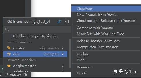 如果当前在master分支上,那么点击Checkout切换到dev分支上,将dev文件拉到本地