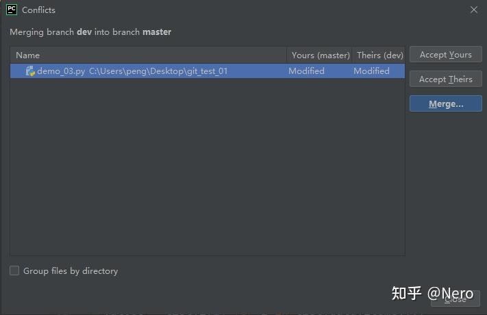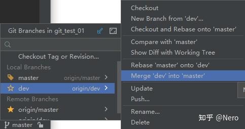 当dev分支文件拉到本地后,再次切换到master分支上,然后点击dev分支里的Merge 'dev' into 'master',将dev分支上的内容合并到master分支上