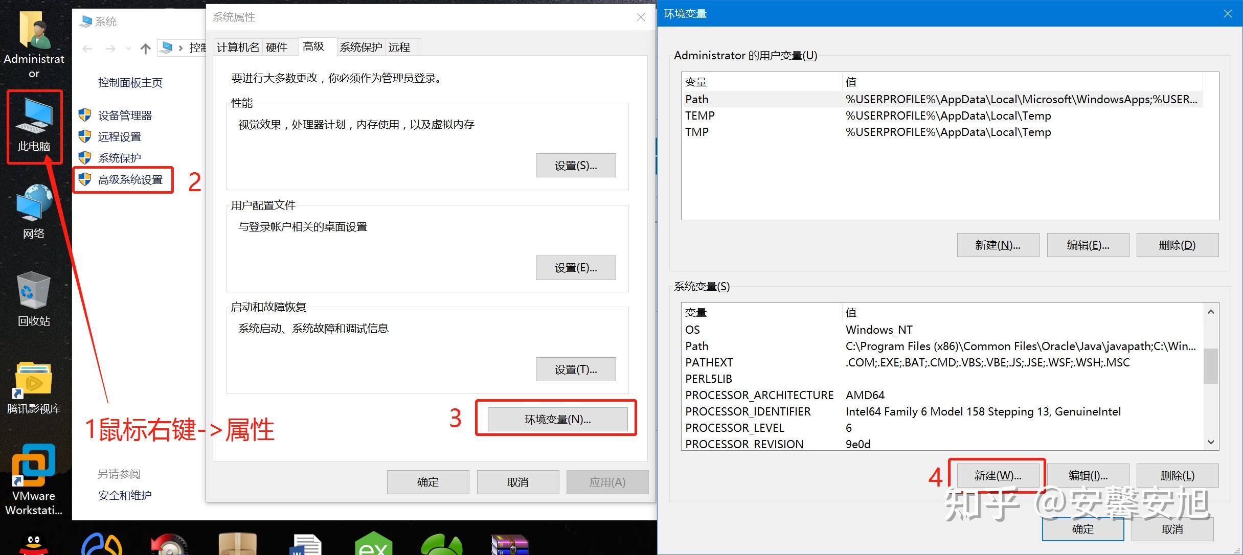 在桌面我的电脑点击鼠标右键,弹出菜单中选择属性,然后点击高级系统设置,在高级系统设置中,点击环境变量按钮,然后点击系统变量中的新建按钮,就可以创建环境变量了