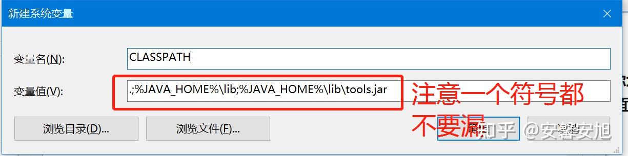 点击系统变量中的新建按钮,添加CLASSPATH环境变量,变量名称填写CLASSPATH,变量值填写.;%JAVA_HOME%\lib;%JAVA_HOME%\lib\tools.jar,注意最前面的.和;都要写进去。