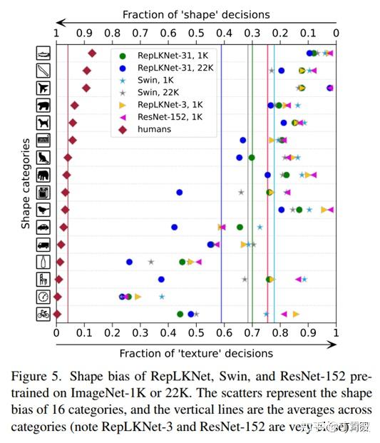 我们又研究了模型的shape bias(即模型有多少比例的预测是基于形状而非纹理做出的), 人类的shape bias在90%左右 ,见下图左边的菱形点。我们选用的模型包括Swin、ResNet152、RepLKNet-31和RepLKNet-3(前文提到的每个stage都是3x3的小kernel baseline),发现RepLKNet-3和ResNet-152的kernel size一样大(3x3),shape bias也非常接近(图中的两条竖直实线几乎重合)。有意思的是,关于shape bias的一项工作提到ViT( 全局attention )的shapebias很高(参见参考文献3中的图),而我们发现Swin( 窗口内局部attention )的shape bias其实不高(下图),这似乎说明 attention的形式不是关键,作用的范围才是关键 ,这也解释了 RepLKNet-31的高shape bias(即更像人类) 。