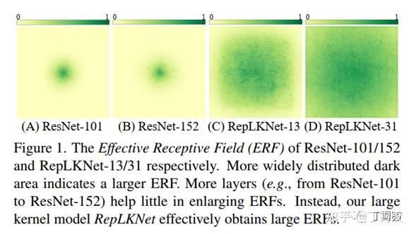 2. 克服传统的深层小kernel的CNN的固有缺陷 。我们 曾经相信 大kernel可以用若干小kernel来替换,比如一个7x7可以换成三个3x3,这样速度更快(3x3x3< 1x7x7),效果更好(更深,非线性更多)。有的同学会想到,虽然深层小kernel的堆叠容易产生优化问题,但这个问题已经被ResNet解决了(ResNet-152有50层3x3卷积),那么这种做法还有什么缺陷呢?——ResNet解决这个问题的代价是,模型即便理论上的最大感受野很大,实质上的有效深度其实并不深(参考文献2),所以有效感受野并不大。这也可能是传统CNN虽然在ImageNet上跟Transformer差不多,但在下游任务上普遍不如Transformer的原因。也就是说,ResNet实质上帮助我们 回避 了“深层模型难以优化”的问题,而并没有真正解决它。 既然深而kernel小的模型有这样的本质问题,浅而kernel大的设计范式效果会如何呢 ?
