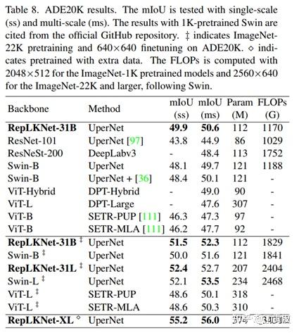 我们给RepLKNet的四个stage设定不同的kernel size,在ImageNet和ADE20K语义分割数据集上进行实验,结果颇为有趣:ImageNet上从7x7增大到13x13还能涨点,但从13x13以后不再涨点;但是在ADE20K上,从四个stage均为13增大到四个stage分别为31-29-27-13,涨了0.82的mIoU,参数量只涨了5.3%,FLOPs只涨了3.5%。所以后面的实验主要用31-29-27-13的kernel size,称为RepLKNet-31B,并将其整体加宽为1.5倍,称为RepLKNet-31L。