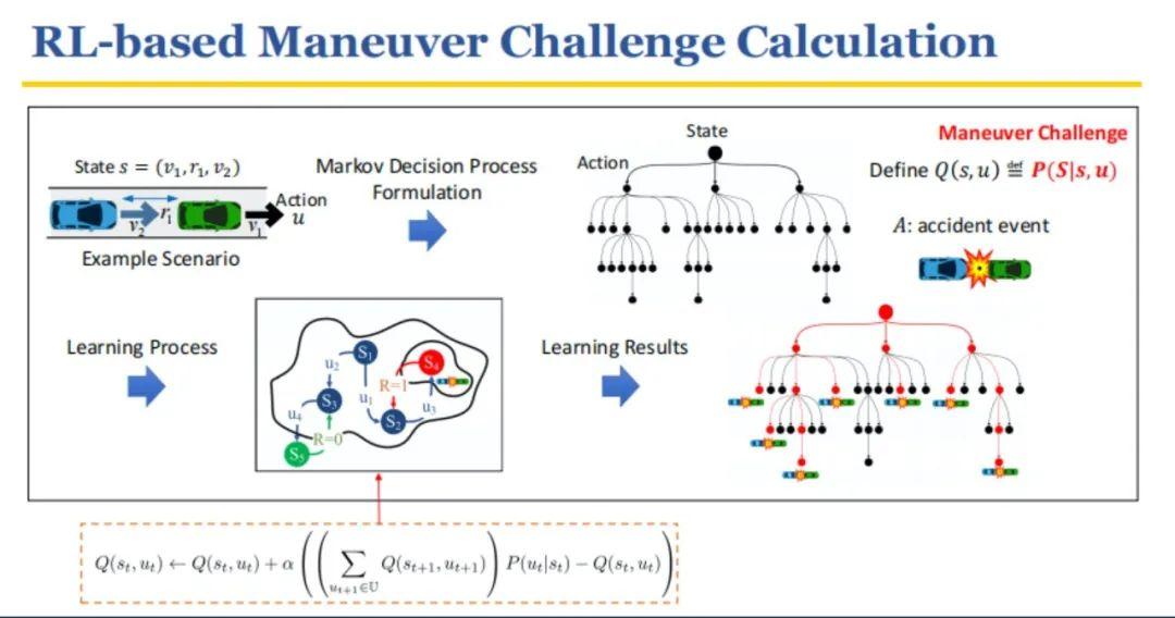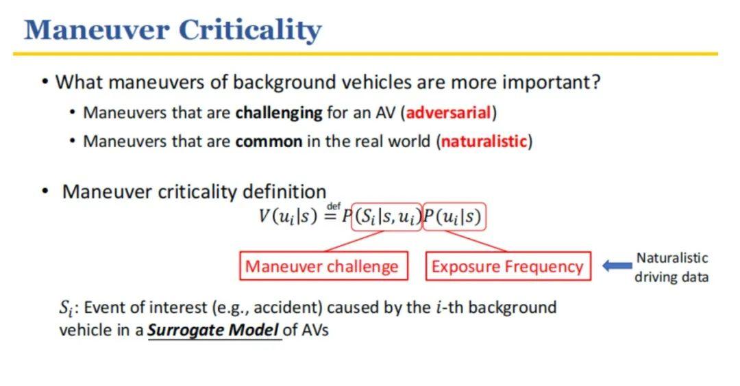 此外,由于自动驾驶事故可能会发生在未来几秒钟之后,那么在预测自动驾驶行为时就需要有一定的时间后效性。所以,在这里引入了强化学习的方法来计算manual challenge。exposure frequency则通过大规模的自动驾驶数据来得到。找到关键车辆得到关键时刻后,只对关键时刻进行重要性采样,其他所有车辆仍然按照自然驾驶汽车概率进行采样。