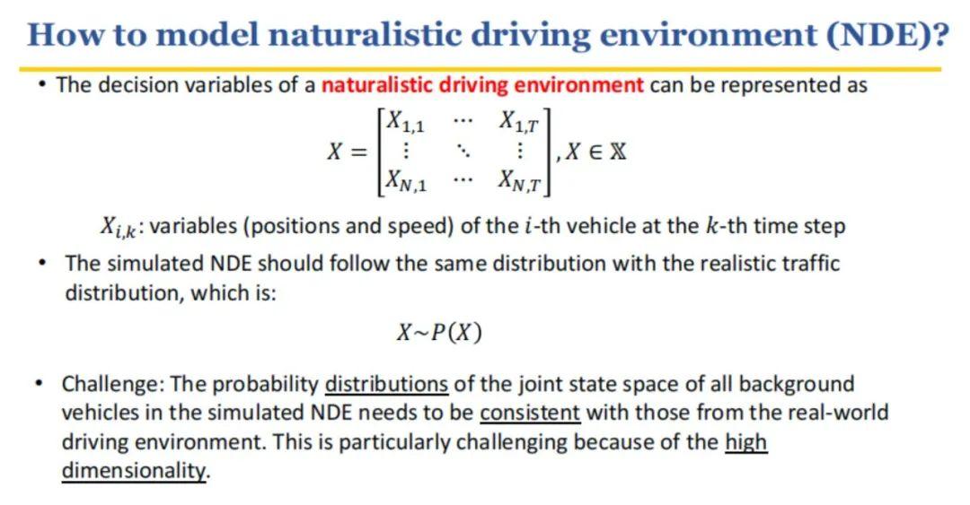 理想情况下,我们可以用一个矩阵 ,把自动驾驶汽车在整个自然驾驶环境中周围交互的,即所有的车辆以及其他的交通参与者,在不同时间的位置、速度、加速度、状态,角色,它的动作等等囊括起来进行描述。其中 , 表示在第 个时间步长中,第 个车辆的变量(位置和速度),N表示BV数量,T表示总的时间点数量。其中NDE应该具有与现实交通分布相同的分布,即 ~ ( )。但模拟NDE中所有背景车辆的联合状态空间的概率分布需要与真实驾驶环境中的概率分布相一致。由于现实情况比较复杂具有高维性,所以尤其具有挑战性。