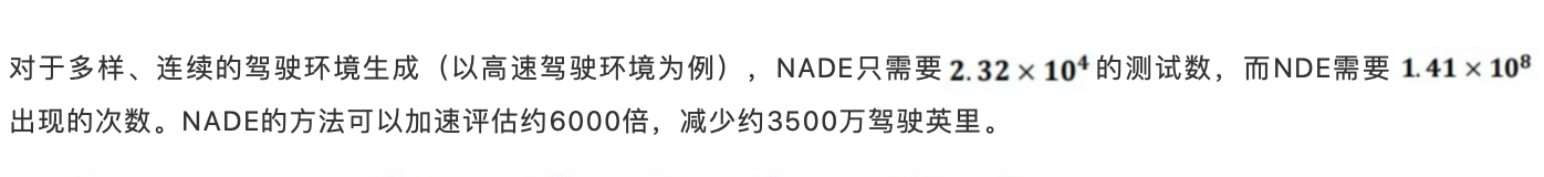 为了解决以上两个挑战,封硕博士等引入了重要性采样建立一个新的抽样分布,它使得 ( )是一种无偏估计,同时也使得所需的测试次数(或测试里程)小于公共道路测试(更少)。该智能测试方法的数学本质就是如何更好地构建一个重要性函数。而其基本思想,就是把这个自动驾驶环境和对抗驾驶环境进行某种程度上的平衡与融合,形成既有自然性又有对抗性的环境,即NADE。理论上可以证明,在这样一个新的环境里,既能保证测试的无偏性,也能大幅提高测试效率,不仅能够应用在低纬度的单一化、片段化的场景生成问题(如换道场景),也能应用在高维度的多样化、连续化的驾驶环境生成问题(如高速驾驶环境)。