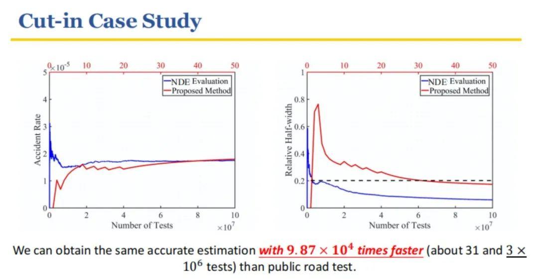 对于单一、片段化的场景生成(以Cut-in场景为例),基于NADE的智能测试方法具有无偏性和高效性,测试效率提升了十万倍。