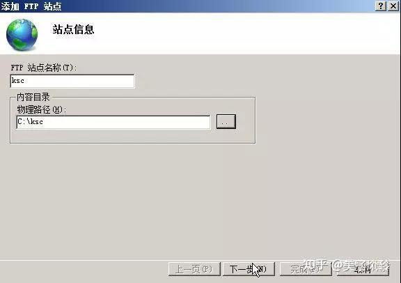 P地址选择:全部未分配,端口为21号端口(默认),SSL选择“无”,点击下一步:输入一个FTP站点名称,并为其添加一个物理路径,点击下一步:
