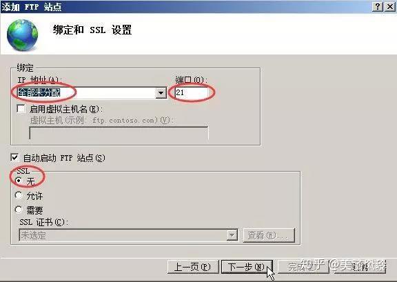 P地址选择:全部未分配,端口为21号端口(默认),SSL选择“无”,点击下一步: