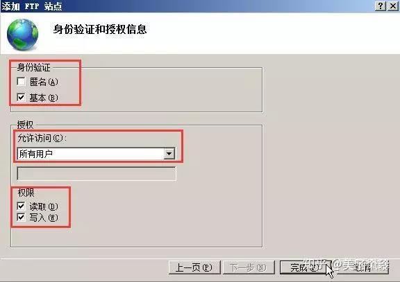 身份验证选择“基本”,授权选择“所有用户”,权限勾选读取和写入(可以按照自己的需要选择授权),点击完成即可完FTP的配置(如果弹出:此网站不存在,请刷新网站列表。您可以点击左侧菜单栏的网站的“+”号即可)