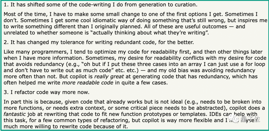 使用体验上,有网友认为自己写代码的方式已经被Copilot改变。具体来说有三点: