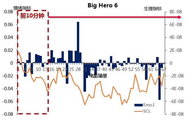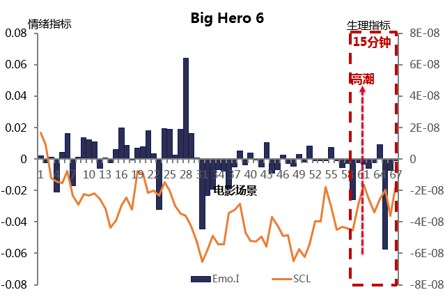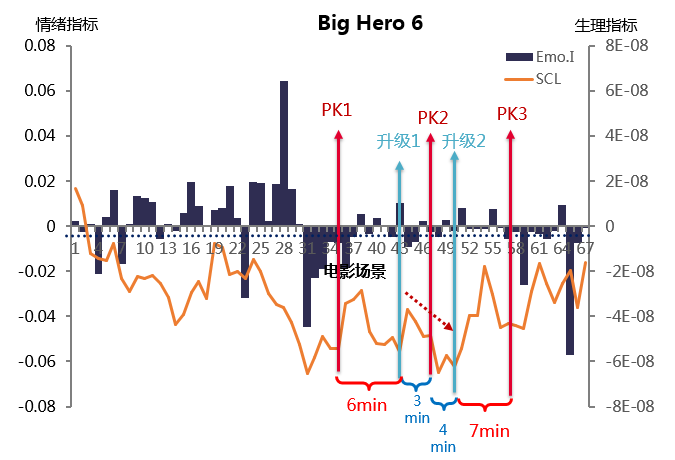 《超能陆战队》中,大白两次升级装备,进行了三次PK。PK事件的间隔约为10分钟,观众情绪体验好。当PK和升级之间的时间间隔变为6-7min左右时,观众的生理兴奋性起伏较大。